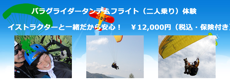- パラグライダータンデム体験コース (インストラクターと一緒に二人乗り(タンデム)でフライトする体験 )